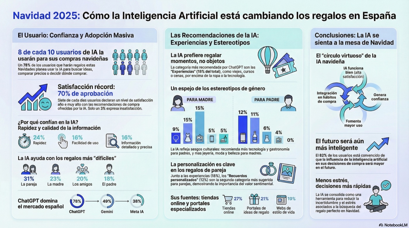 Los datos son claros: el 82% de los usuarios cree que la inteligencia artificial tendrá mayor influencia en sus compras futuras. Esta Navidad de 2025 puede que sea recordada como el punto de inflexión, el momento en que pedir consejo a ChatGPT para elegir regalos dejó de ser algo novedoso y se convirtió en lo normal.
